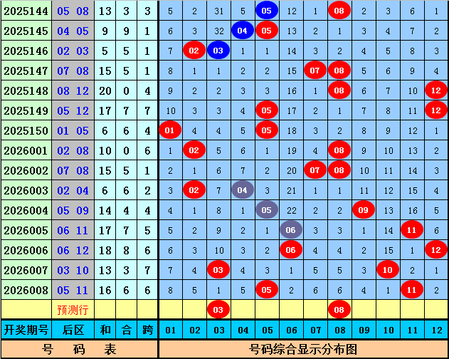 后区号码分析:第009期历史同时开奖中,后区两码全翻开出4次,全小开出2次,一大一小开出13次,本期后区预测出现一大一小奖号,参考号码03、04、06、08。