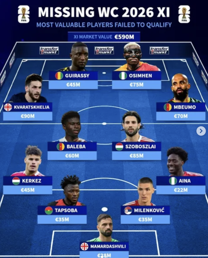前卫:吉拉西(几内亚/4500万);奥斯梅恩(尼日利亚/7500万)